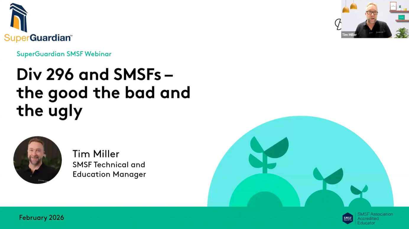 The SuperGuardian monthly Adviser webinar program gives SMSF professionals a practical insight into the latest issues impacting SMSFs. For upcoming events click here.